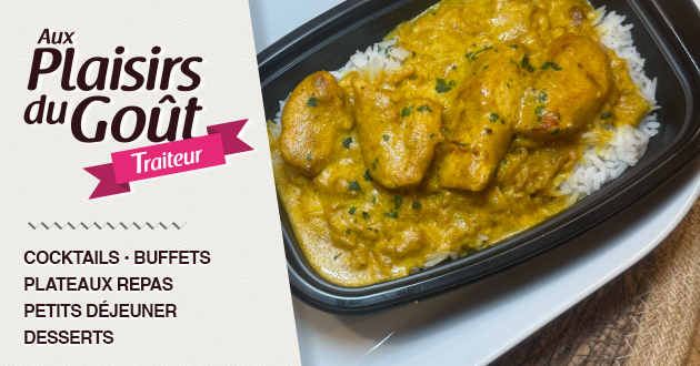 <ul style="list-style-type: square;"> <li>Taboulé, cruditées</li> <li>Poulet curry, riz thai</li> <li>Mousse au chocolat</li> </ul>